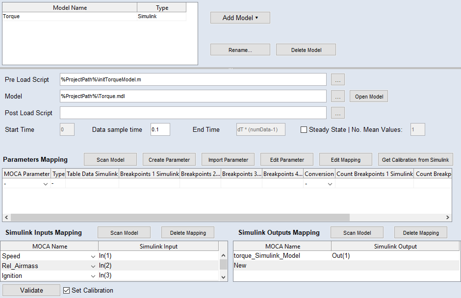 button) path and name of an executable M-script in the Pre Load Script field.This Init script is optional and may contain a pre-calibration for the Simulink model. The pre-calibration is expected as a MATLAB workspace variable that will be assigned in the Parameters Mapping table.