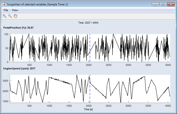 "Scope View" window shows the selected variables versus time. If you assign several variables to one scope, each variable is plotted in a