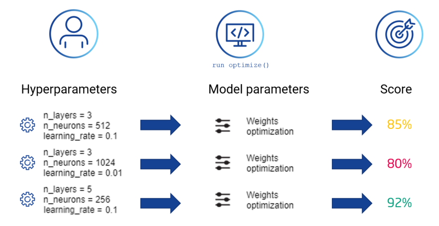 Hyperparameters are all parameters which can be set individually by the user before the model training starts (e.g. number of layers or learning rate). Model parameters are instead learned during the model training (e. g. weights in neural networks). Finding good machine learning models is a type of an optimization problem. With a series of hyperparameters it is targeted to find the right combination of the values that provides the best model delivers.