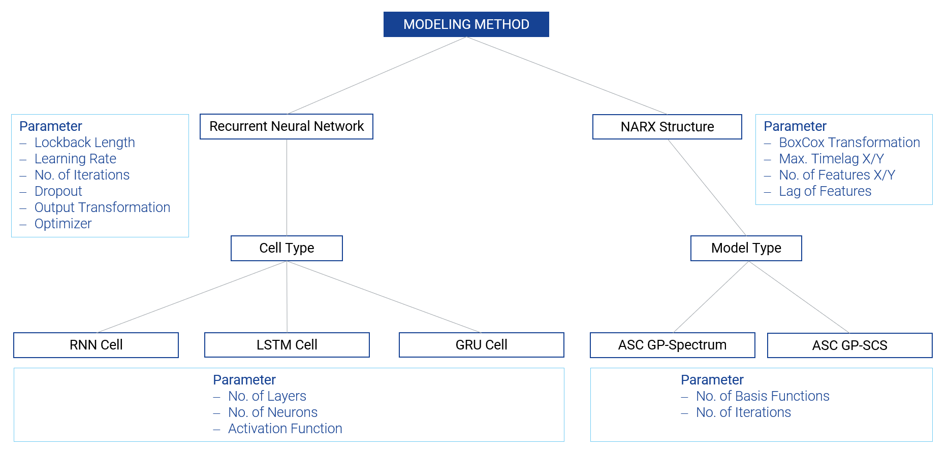 The different modeling methods RNN and NARX have different hyperparameters.