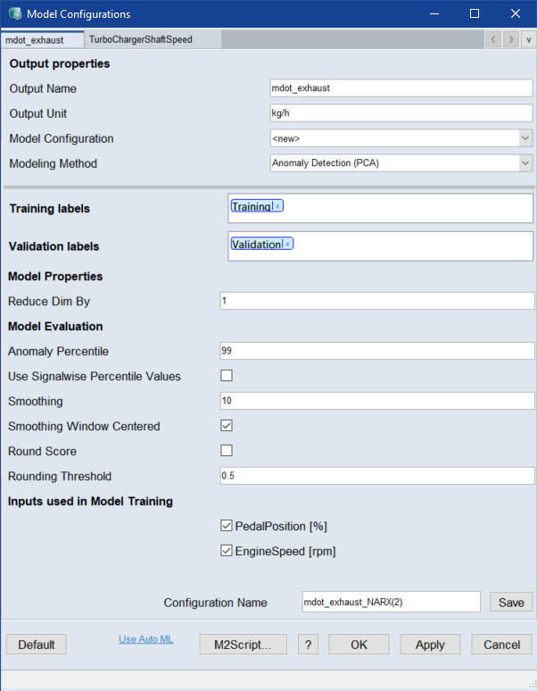 When you select the Anomaly Detection (PCA) modeling method Model > Configurations, the Model Properties area of the <output> tab contains the following elements. For each output there is a separate tab.