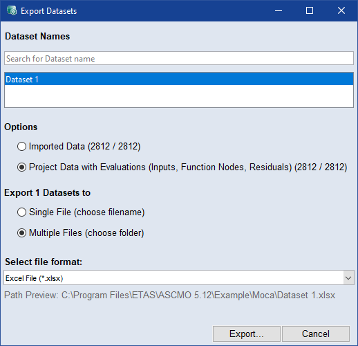 Export Datasets ウィンドウが開き、エクスポートフォーマット(*.xls/*.xlsx、*.csv、*.dat、*.mf4、*.mat)を指定することができます。