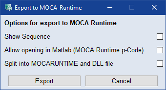 Export to MOCA Runtime ウィンドウが開き、*.moca_runtimeへのエクスポートに関する設定を指定することができます。