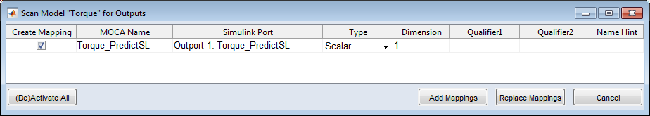 Add Mappings では、Simulink Outputs Mapping リスト内の既存の内容はそのまま保持されます。既存の行が再度選択されると、その選択は無視され、ログウィンドウに警告メッセージが発行されます。