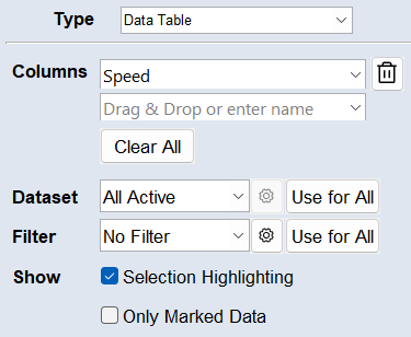 ボタンを使用します。Use for All ボタンにより、タブ内の全エレメントに対してコンフィギュレーションが適用されます。アクティブデータセットを変更するには、Data > Active Datasets メニュー、または可視化ステップの Active Datasets ハイパーリンクを使用します。
