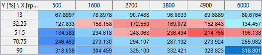 選択されているパラメータの値が表示されます。カーブ/マップ/キューブの場合は、テーブルの列と行のヘッダに、それぞれ軸が表示されます。列ヘッダには1番目の軸が表示されます。行ヘッダには2番目の軸(y)が表示されます。各セルにはパラメータ値が表示されます。