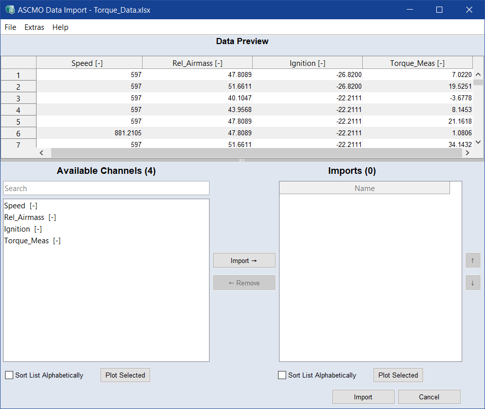 Available Channels リストで選択されているデータチャンネルを Import リストに追加します。