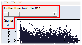 散布図内に、外れ値のしきい値を調整する Outlier Threshold スライダと Sigma 編集フィールド(標準偏差)を