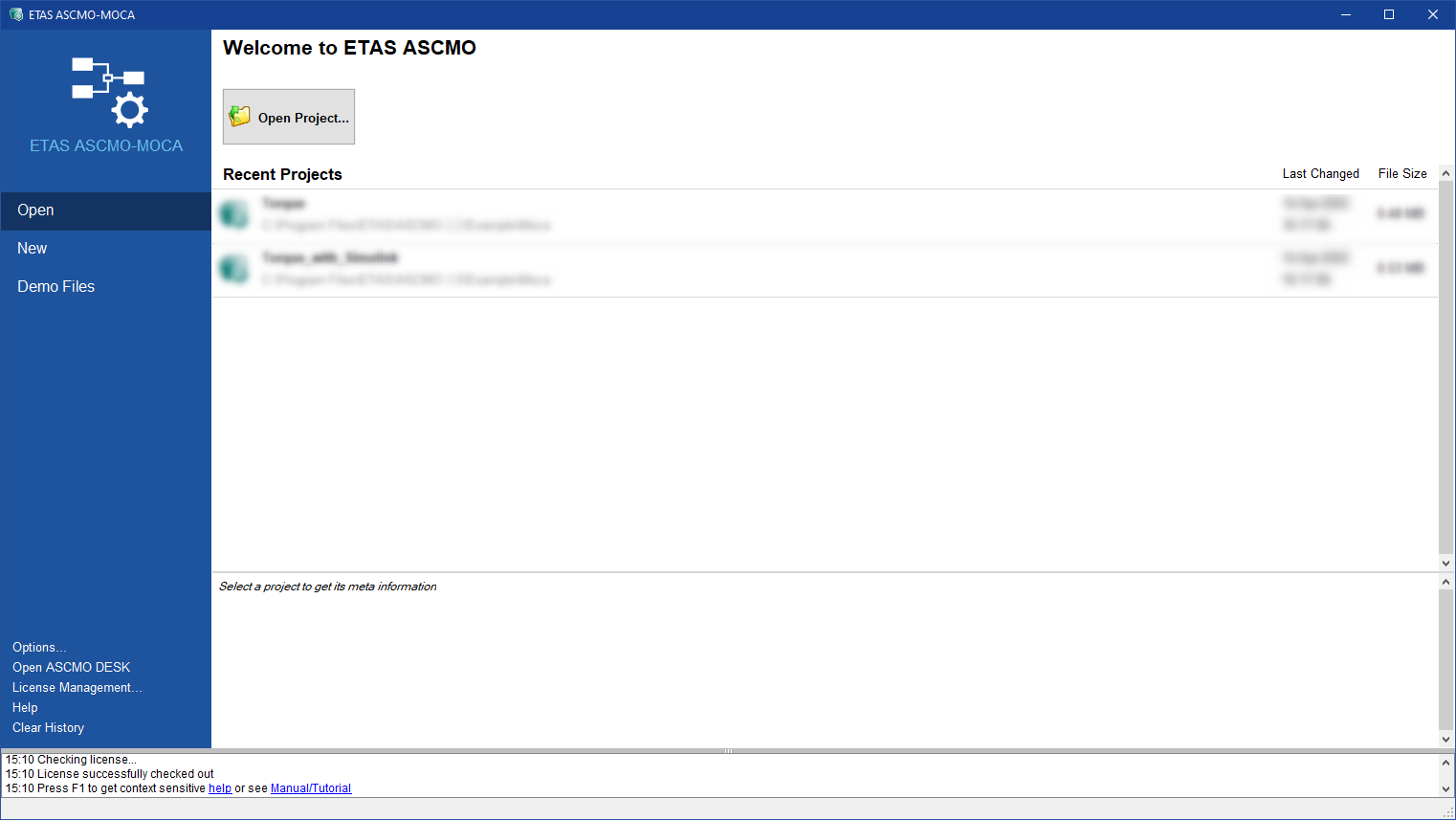 リストからプロジェクトを選択すると、そのプロジェクトのメタ情報がリストの下に表示されます。5.10より前の製品バージョンで最後に保存されたプロジェクトの場合、メタ情報を表示させるには