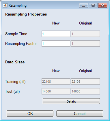 測定データのサンプリング周期 Ts は、短すぎる(つまりサンプリング周波数が高すぎる)場合があります。適切なサンプリング周期はおよそTs <= T/10(Tはシステムの主要時定数)です。そのような場合は、データセットをリサンプリングすることができます。ダウンサンプリングされたデータセットはトレーニング時間を短縮でき、後のモデリングへの利点ともなります。