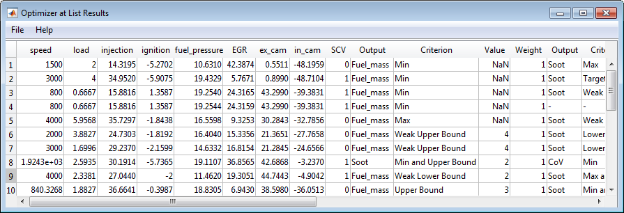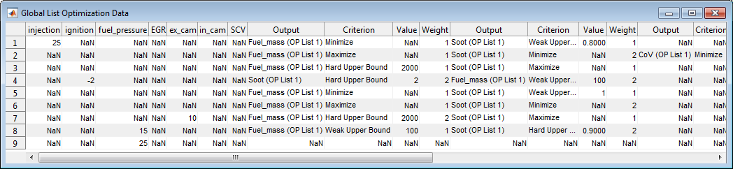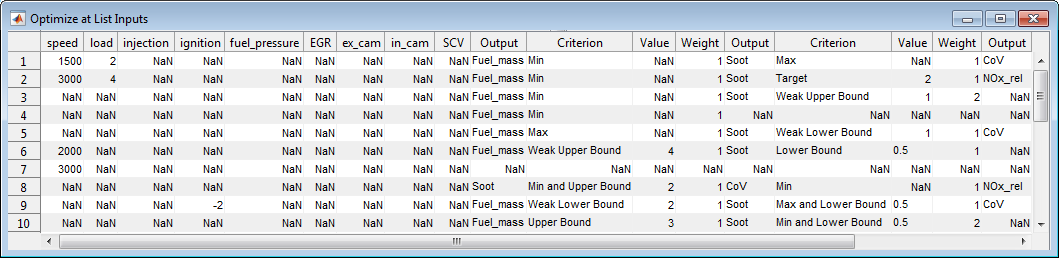 リストの各行に、1 回の最適化で使用するすべての目標を定義します。各行の先頭部分には、最適化を実行する際の各入力の値を定義します。これらの値は Excel ファイル上でしか変更できません。これに続いて各最適化目標を定義しますが、これは前述の "Single Result Optimization" ウィンドウや "Global Optimization" ウィンドウで設定するものと同じです(最適化目標を参照)。