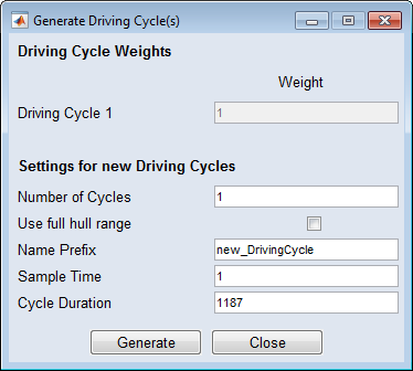 "Generate Driving Cycle(s)" ウィンドウ