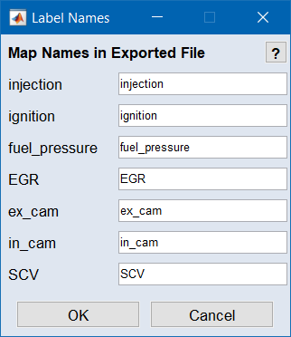 すべての入力の適合マップをファイル(DCM、CDFX、CSV)に保存します。保存する前に、変数ラベルの名前を入力するためのウィンドウが開きます。