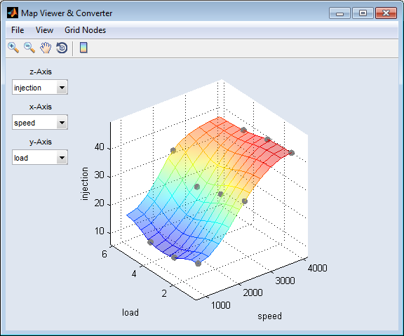 "<input> Calibration Map" ウィンドウが開き、選択された入力について、最適化時に複数の動作ポイントにおいて得られた適合マップが表示されます。