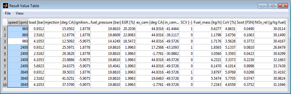 "Result Value Table" ウィンドウ が開き、最適化が実行されたすべての動作ポイントにおける入力/出力の最適化結果が含まれるテーブルが表示されます。