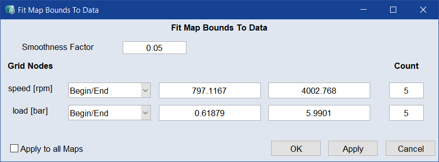 すべての入力の測定データについて、測定データの最大値と最小値を上下限値とします(参照:"<input> - Map Bounds" ウィンドウ)。
