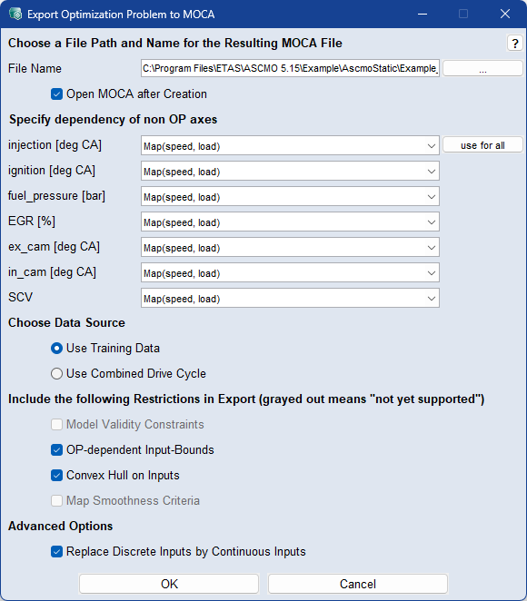 "Export Optimization Problem to MOCA" ウィンドウを開き、グローバル最適化の現在の問題をMOCAプロジェクトにエクスポートします。