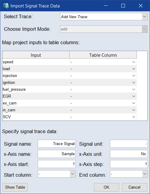 Select Trace フィールドと Choose Import Mode フィールドでインポート処理を選択し、入力(Input 列)をテーブル(Table Column 列)に割り当てて、名前(Signal name/x-Axis name フィールド)と単位(Signal unit/x-Axis unit フィールド)を入力します。