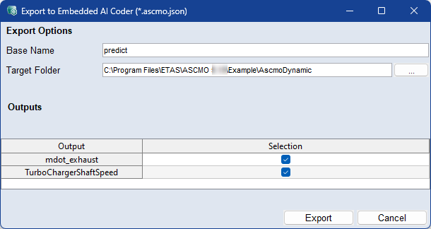 "Export to Embedded AI Coder" ウィンドウ