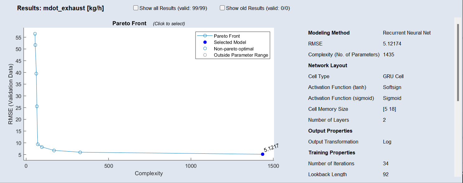 見つかったモデルのRMSEに応じたパレートフロント(モデルの複雑度vs.モデル品質)が表示されます。メタデータを表示するには、プロット内のモデルをクリックします。モデルを削除するには、モデルを右クリックして Delete Selected Model をクリックします。複雑さは、各モデルのサイズとメモリ所要量に対応します。測定されるのはメモリ消費量のみですが、これはモデルの計算がより複雑になることも意味します。