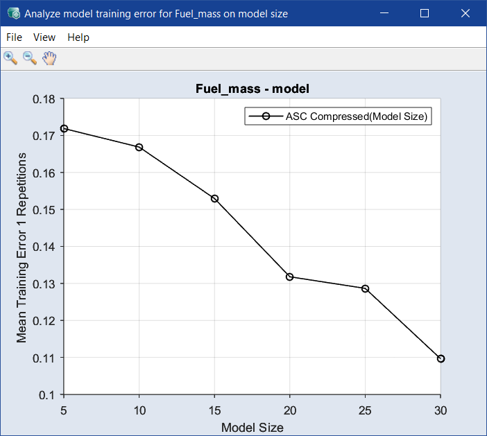 出力を選択して OK をクリックします。Error on training data over Model Size ウィンドウが開きます。