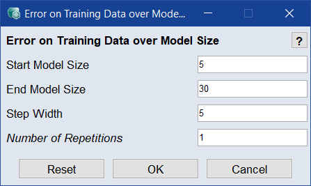 ここでは、誤差の計算に使用するパラメータの値(調査開始時のデータ量 Start Model Size、調査終了時のデータ量 End Model Size、各データ間の距離 Step Width、サブセットの数 Number of Repetitions)を入力します。