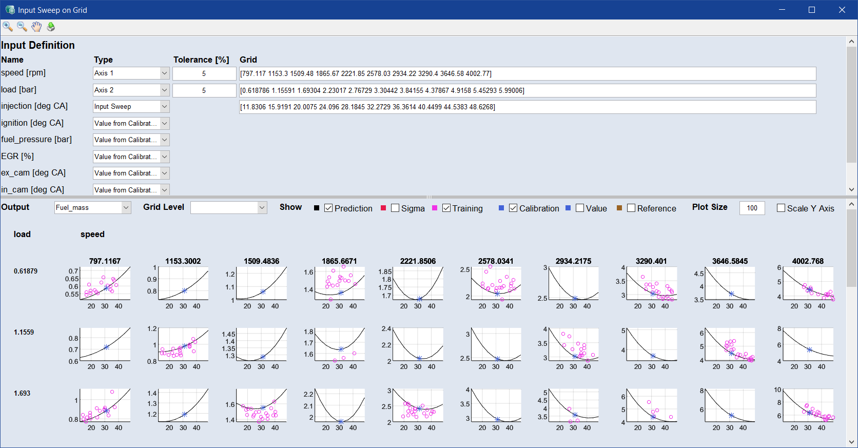 Input Sweep on Grid 機能により、入力に依存するモデルの挙動を視覚的に表現することができます。ワーキング適合データとリファレンス適合データを直接比較したり、予測データとトレーニングデータを比較したりすることができます。