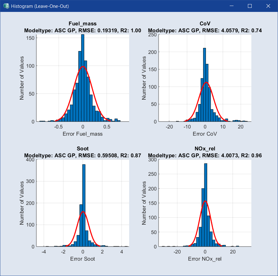 ここでは2つのウィンドウが開きます。1つには正規確率のプロットが表示され、もう1つには出力変数の測定値とモデル値の絶対偏差のヒストグラムが表示されます。