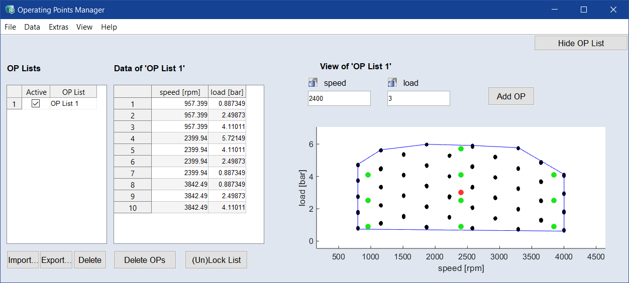 • 選択した動作ポイントを "Operating Point List" ウィンドウに追加することができます(File > Add Current Setting as Operating Point)。これはマップ生成時に役立ちます。