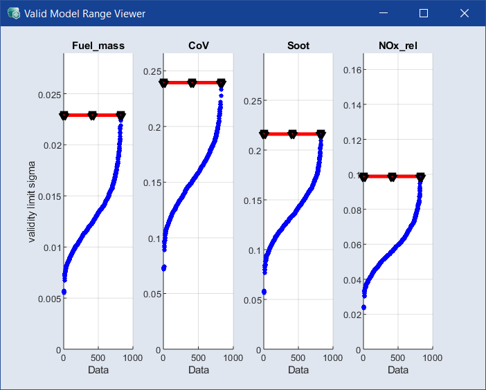Valid Model Range Viewer ウィンドウが開き、データとしきい値が表示されます。黒い逆三角形の付いた赤い線で示されるしきい値は、マウスで移動することができます。