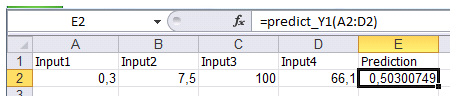 モデル予測はExcel用の関数として提供されます。以下のように、モデル予測用の入力データ(例: A2、B2、C2、D2)を入力し、予測結果のセル(E2)で関数(例:"=predict_Y1(A2:D2)")を使用してください。