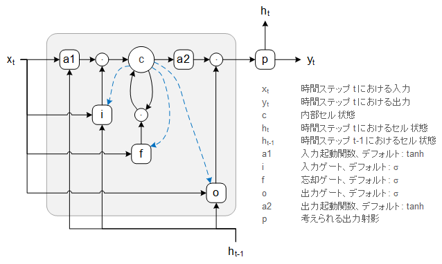 図17: LSTMセルの概略レイアウト:入力 xt および前回のセル状態 ht-1 は、セルの入力起動関数 a1、入力ゲート i、忘却ゲート f、出力ゲート o に供給され、セルの内部状態はより大きなノード c によって表されるステップ t と t−1 の両方のセルの内部状態 c と出力起動 a2 とが要素ごとに乗算されて組み合わされ、セルの出力を生成する。この出力は、トレーニングされるパラメータの数を減少させる目的で出力射影層 p に供給される。この結果として、時間ステップ t における出力 yt とセル状態 ht が得られる。青い破線の接続は、以下のテキストで説明されている「ピープホール接続」を表す。