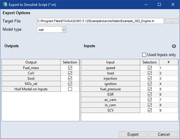 使用されている入力のみをエクスポートするには、Used Inputs Only を選択します。