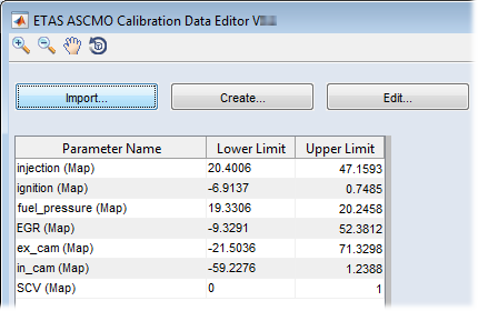 パラメータデータは、DCMファイル(*.dcm)、適合データファイル(*.cdfx)、カンマ区切りのテキストファイル(*.csv)、列または行列を含むExcelファイル(*.xls、*.xlsx、*.xlsm)、ASCMOプロジェクト(*.ascmo)からインポートすることができます。