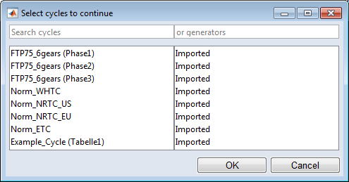 "Training Basis"として選択されているすべての走行サイクルに含まれる列のみが、走行サイクルの生成に使用できます。