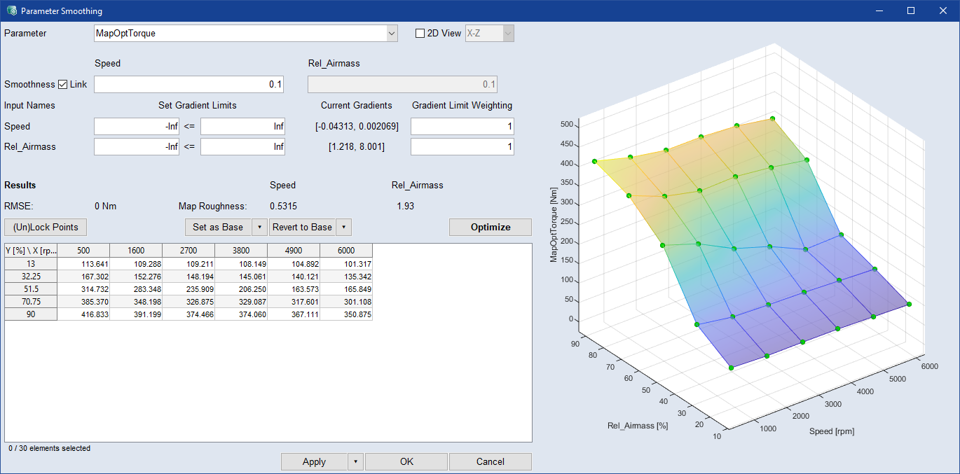 最適化実行中にパラメータ粗度低減のために使用される平滑化係数を入力します。値が大きいほど粗度が下がります。範囲は[0 - ∞]です。