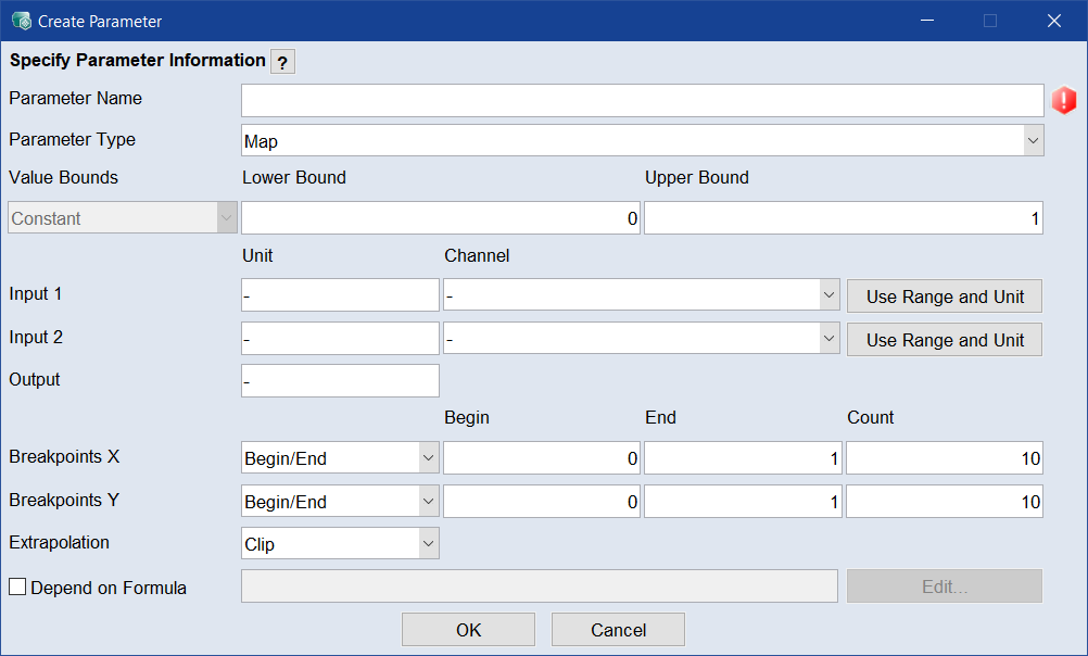 Parameter Name: MapOptTorque Parameter Type: Map Value Bounds: 0 - 500 Input 1: Speed Input 2: Rel_Airmass Breakpoints X: Begin/End; Begin = 500; End = 6000; Count = 6 Breakpoints Y: Begin/End; Begin = 10; End = 90; Count = 6 Extrapolation: Clip Note
