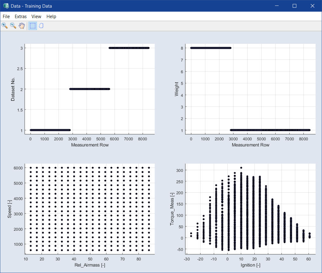 The bottom-left plot (Speed over Rel_Airmass) shows the space-filling variation of the data in the experimental plan.