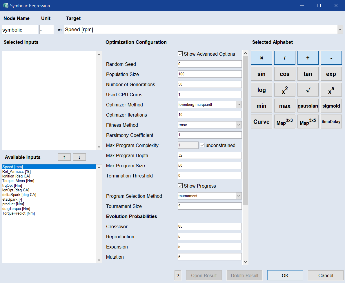 Select the items you want to include into Symbolic Regression. Enabled building blocks are shown as blue colored buttons.