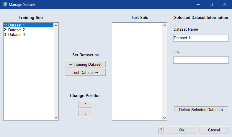 Moves a selected training dataset, or test dataset up or down in the list.