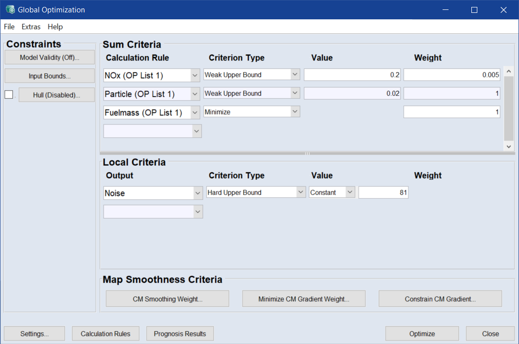Further criteria can also be defined, e.g. that engine noise must not exceed 80 dB. This is specified as a Local Criterion (Hard Upper Bound / 80 dB) and can be set either for all operating points (Value = Constant) or for each individual operating point (Value = per OP).