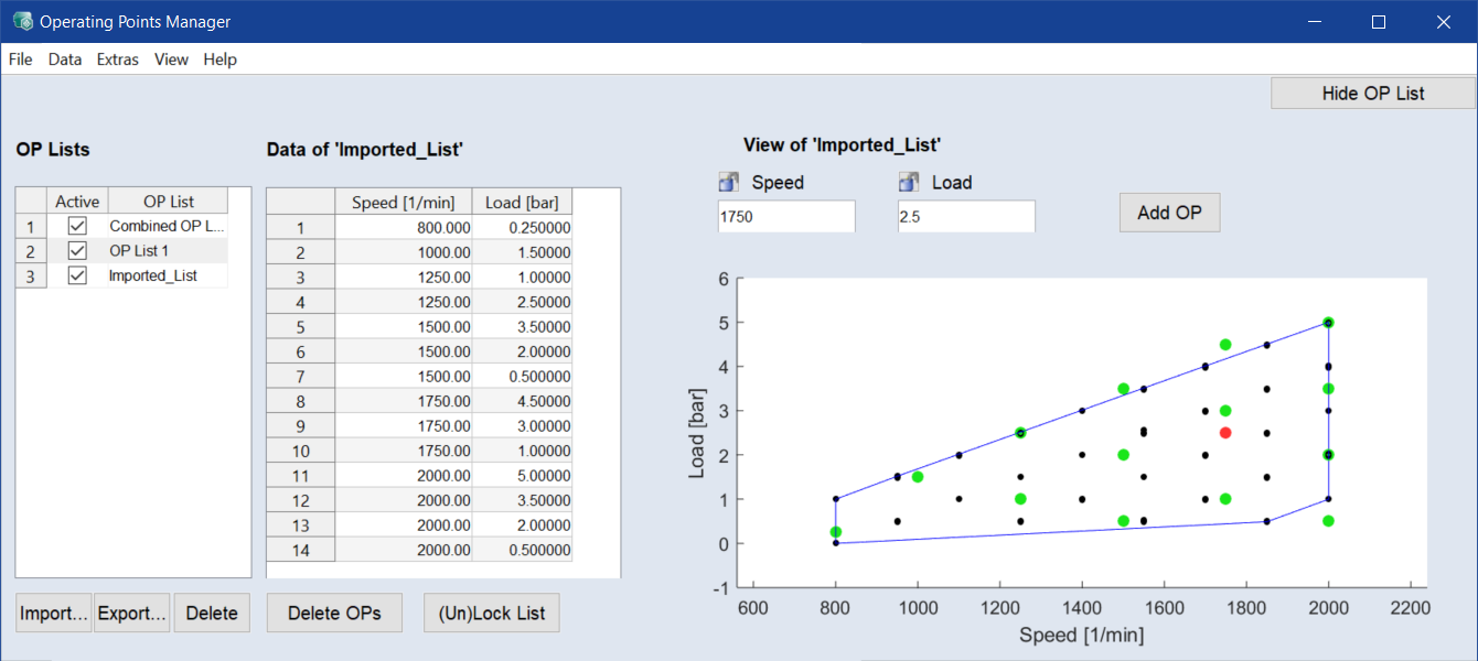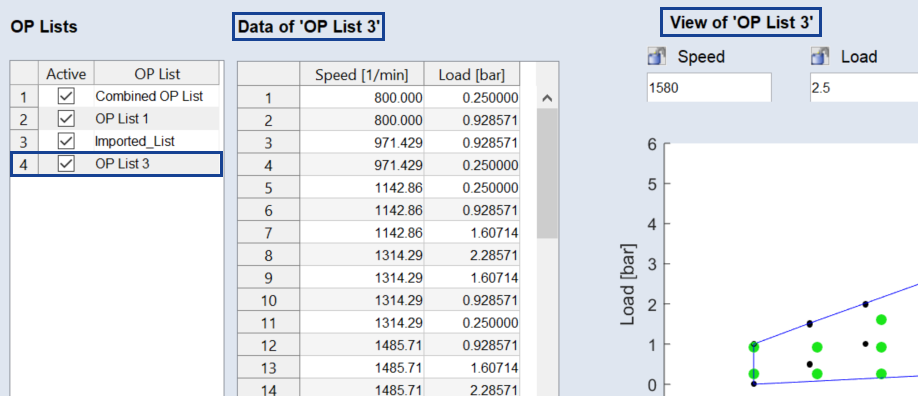 A new list is set up and shown in the operating points manager (see below) and in a separate window. The list is selectable separately or in combination with other lists.