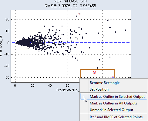 To mark the points within a specific rectangle as outliers, right-click the edge of the particular rectangle and select Mark as Outlier in Selected/All Outputs.