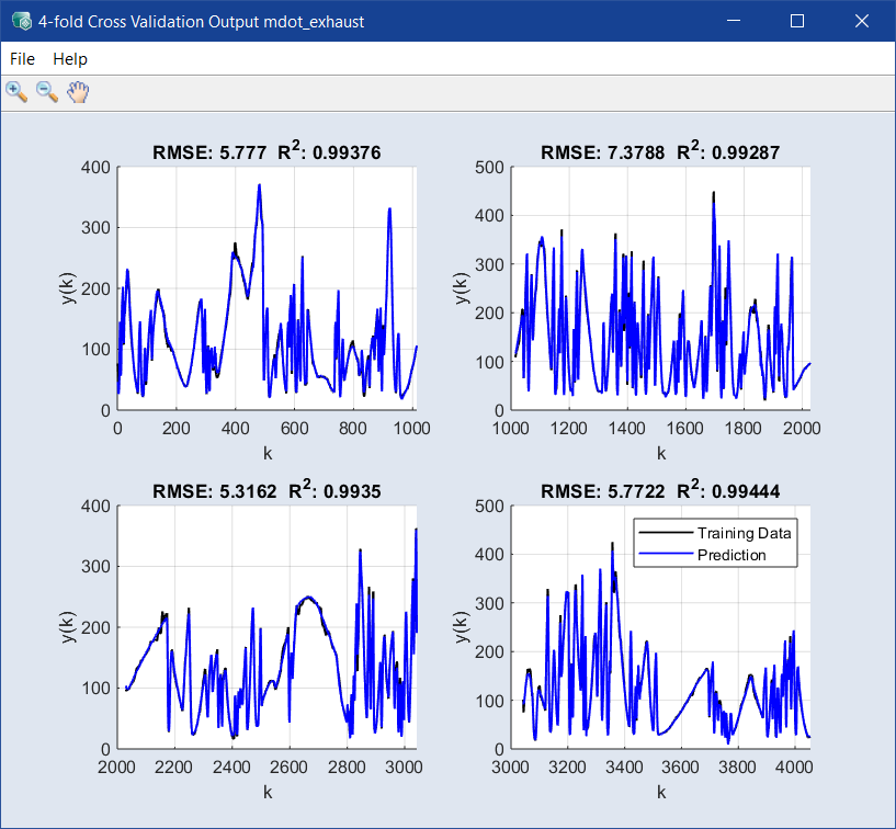 For each output, n plots are displayed. Each plot is the result of an individual model training on n-1 data sets and the prediction on the data set not used for modeling.