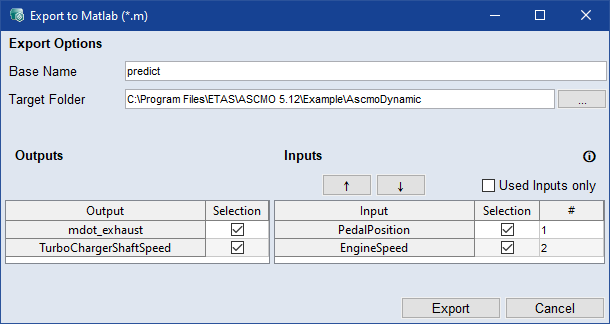1. Select the Inputs and Outputs to export in the table. The order in which the inputs are passed to the exported model can be changed using the and buttons.