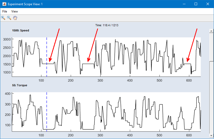 For demonstration purposes, a cycle file with constant values has been imported into an ASCMO-DYNAMIC ExpeDes project. Snippets are 20 - 40 ts long, and the minimum duration between two snippets is 100 ts. These demo snippets can easily be seen in the