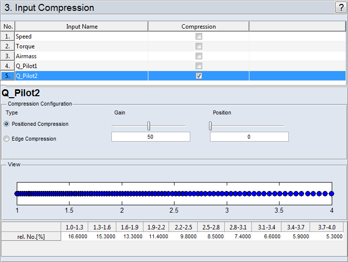 In this area, the position of the measurement points and, therefore, the measure of the selected compression is graphically displayed. In the table, the percentage of measurements in the respective interval resulting from the compression is specified in the "rel. No.[%]" row.