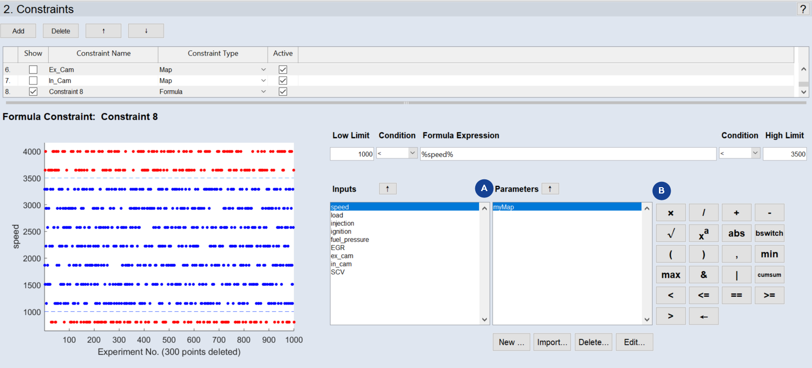 Use the Formula Expression field to enter the formula. Any Matlab relational expression can be entered here. If the expression is violated, the corresponding measurement points are rejected. Variables can be either inputs or curves/maps (1D or 2D) that are selected and managed in the Inputs area and the Parameters area. Operators are entered directly or via the button area (B in ASCMO-STATIC ExpeDes Step 2: Constraints (Type "Formula")).