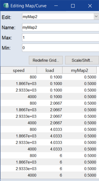 Maps/Curves are displayed as a table or plot and can be edited here.