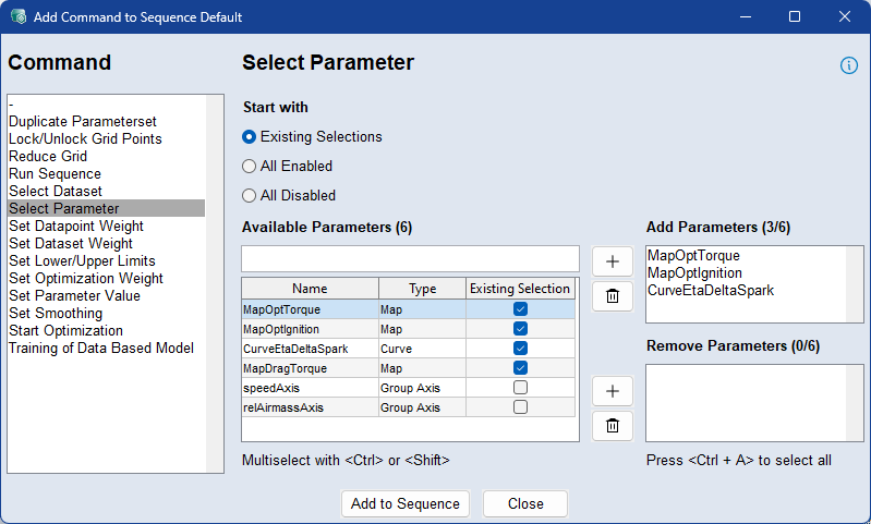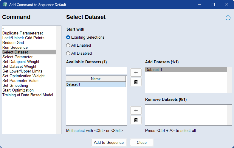 Use the Select Dataset command to activate or deactivate specific training datasets for optimization. This allows you to control which datasets contribute to the optimization process at different stages in the sequence.
